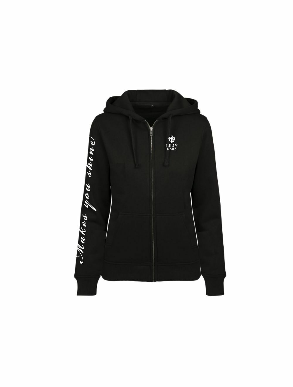 Huppari Lilly Nailsin logolla ja iskulauseella "Makes you Shine". Mukava pitkähihainen ja vetoketjullinen - täydellinen työvaate salongissa.